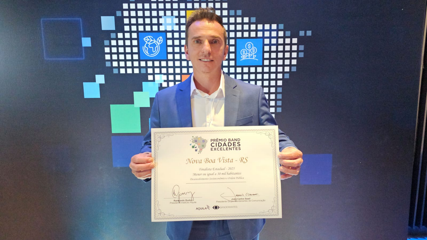 Nova Boa Vista voltou a se destacar no cenário estadual ao conquistar o 3º lugar no Prêmio Band Cidades Excelentes 2025, no pilar Desenvolvimento Socioeconômico e Ordem Pública. A cerimônia ocorreu na quarta-feira (26), em Porto Alegre. O prefeito Cléber Badin participou do evento acompanhado do secretário de Planejamento, Desenvolvimento Econômico e Inovação, César Manfro.