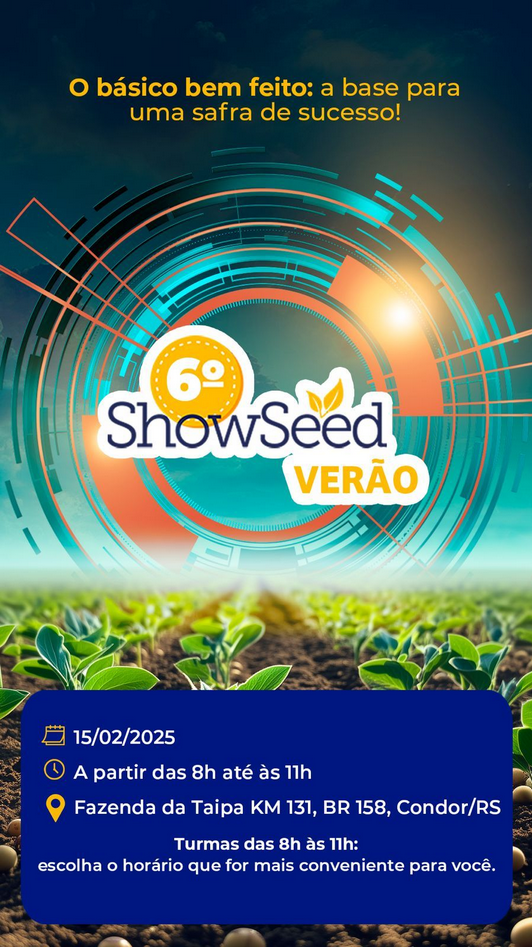 A Strobel Sementes, referência em sementes de alta performance, convida toda comunidade do agronegócio para 6º ShowSeed Verão, que acontecerá em 15 de fevereiro de 2025, das 8h às 11h ( cada participante pode escolher o horário mais conveniente para fazer a visitação) , na Fazenda da Taipa, Condor/RS. Este evento exclusivo é uma oportunidade única para produtores e especialistas do setor agrícola se conectarem e explorarem inovações em manejo e produtividade.