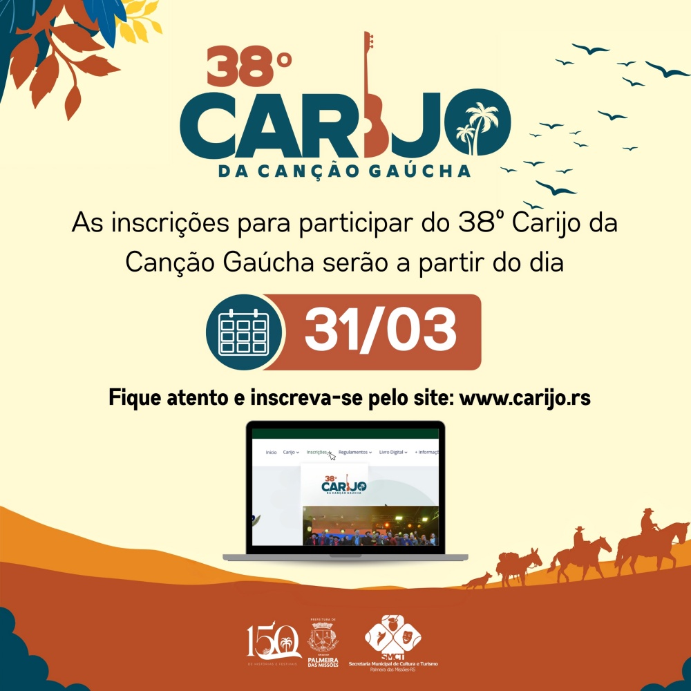 As inscrições para o 38º Carijo da Canção Gaúcha começam nesta segunda-feira (31). Os artistas interessados poderão inscrever suas músicas até o dia 24 de abril, exclusivamente pelo site oficial do evento, disponível em https://www.carijo.rs/.