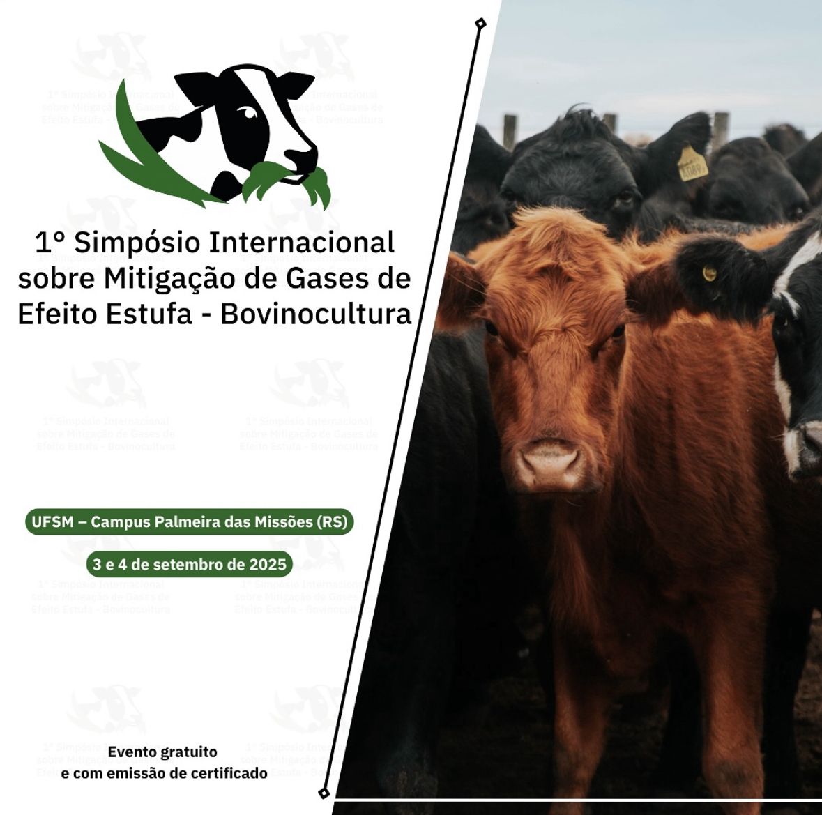 Nos dias 3 e 4 de setembro de 2025, será realizado o 1º Simpósio Internacional sobre Mitigação de Gases de Efeito Estufa na Bovinocultura, no campus da Universidade Federal de Santa Maria UFSM, em Palmeira das Missões. O evento tem como foco a apresentação e discussão de práticas, tecnologias e estratégias voltadas à redução de emissões na produção pecuária.