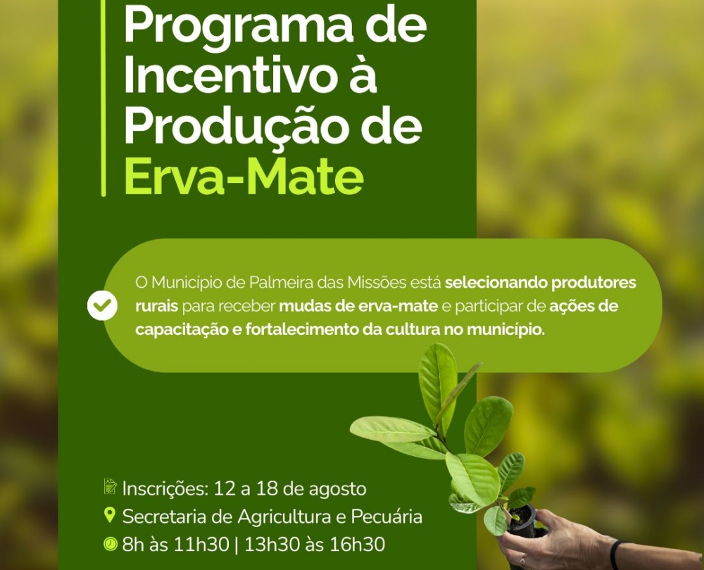 A Administração Municipal de Palmeira das Missões por meio da Secretaria Municipal de Agricultura e Pecuária, abriu inscrições para o Programa de Incentivo à Produção de Erva-Mate. O programa tem como finalidade selecionar produtores para o recebimento de mudas e participação nas ações previstas.