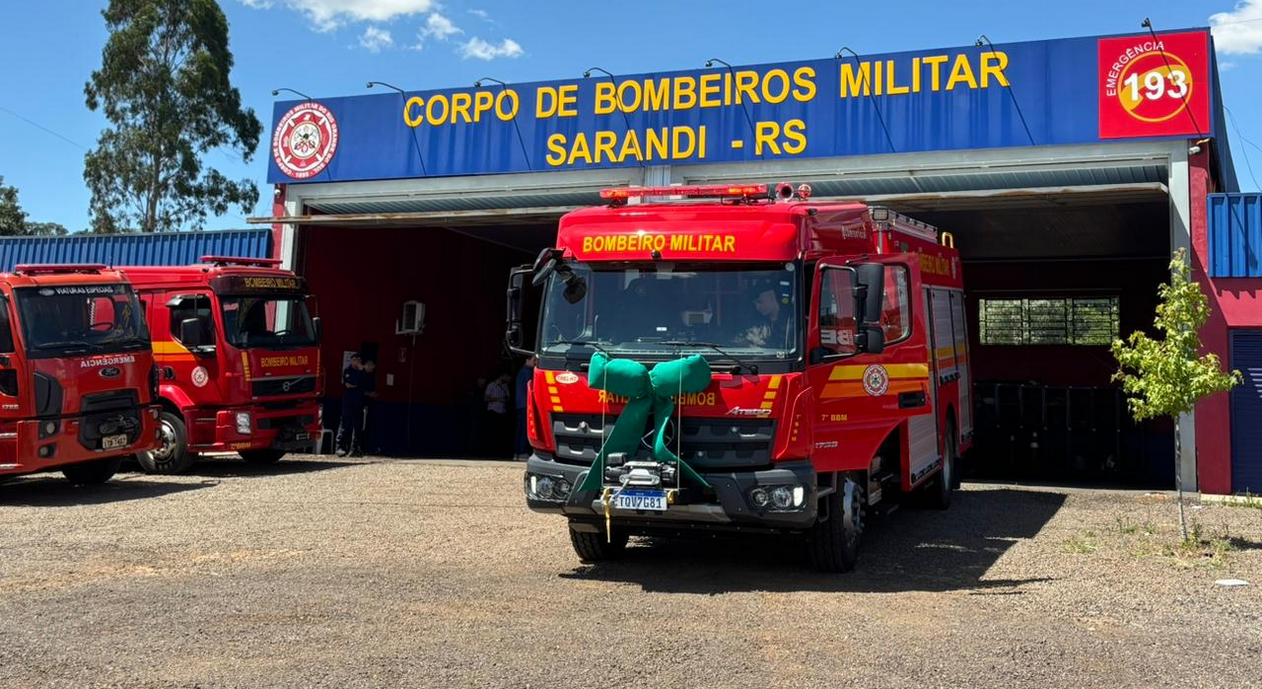 Os Bombeiros Militares de Sarandi receberam, nesta quarta-feira (19), um caminhão ABTS (Auto Bomba Tanque e Salvamento) avaliado em mais de R$ 2 milhões, reforçando as operações do Pelotão responsável por atender Sarandi e outros nove municípios da região. O investimento do Governo do Estado busca ampliar a capacidade de resposta em ocorrências de incêndio, resgate e salvamento.