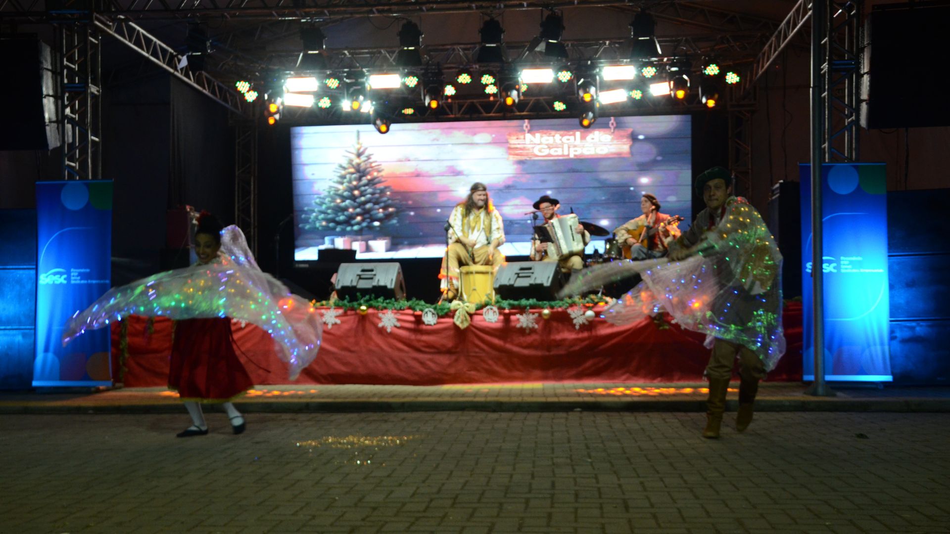 Na sequência, às 20h30, o público acompanhou o espetáculo Natal de Galpão, apresentado pelo Grupo UEBA, com apoio cultural do Sesc Palmeira das Missões. Às 21h, Fernando de Moraes e o grupo Cantando a Fé realizaram uma apresentação musical de caráter religioso.