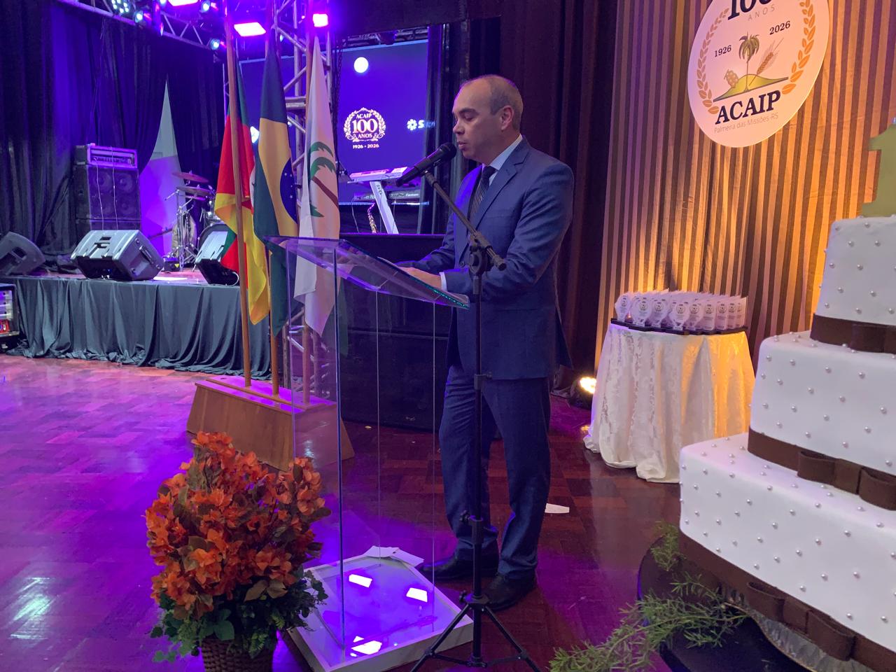 Durante pronunciamento, o presidente da ACAIP, Diego Mafalda, destacou o significado do centenário e a trajetória da entidade na defesa dos interesses do setor produtivo.
